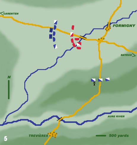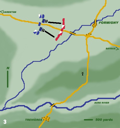 The direction of Kyriell's march headed for Bayeux and brought him near Carentan by the 12 April. The Count of Clermont refused to engage the English in spite of being urged to do so by the town’s people. In the end it had been left to the town’s militia to make a sortie at the rearguard of Kyriell’s army, which was repulsed as he by-passed the town. On 14 April heading Eastwards, Kyriell's army camped near the village of Formigny about 10 miles from Bayeux. De Clermont remained at Carentan 15 miles West. Meanwhile de Richemont was moving through St. Lô 19 miles Southwest, in an effort to join Clermont and intercept the English before they reached Bayeux.
